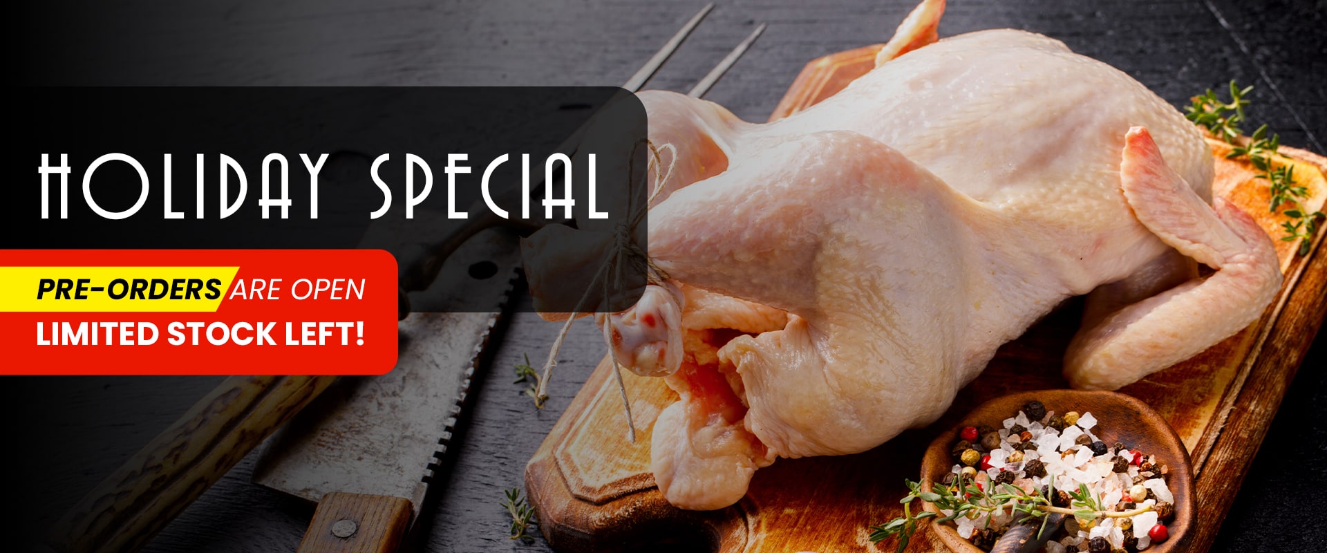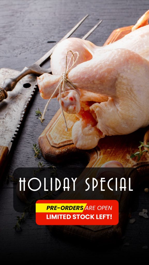 Our Whole Turkey is a tender, flavorful halal bird hand-slaughtered by Muslims in accordance with Islamic law. Raised locally without hormones or antibiotics, this young turkey offers juicy, delicate meat that’s perfect for roasting or smoking. Ideal for holidays or any special meal.